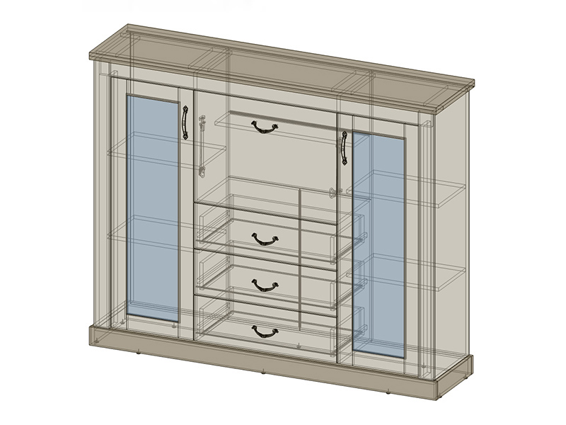 код 118769Универсальный шкаф с тонированным стеклом. Три фасадные шухляды и полки внутри.
