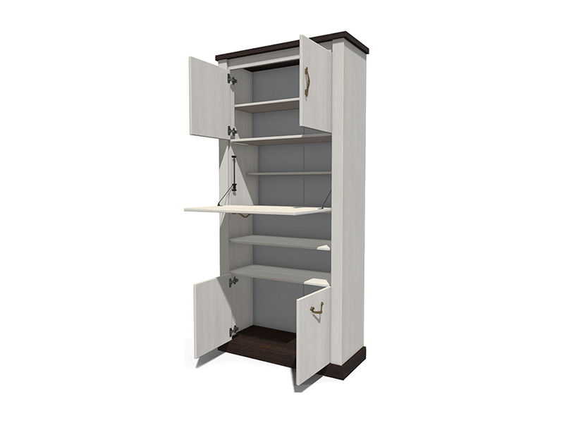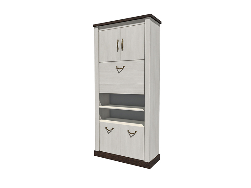 Вместительный шкаф для гостиной или спальни наполнен большим количеством открытых и закрытых полок. Конструкция оснащена распашными и откидными дверцами. На фасаде каждой двери есть стилизованная «под старину» ручка в цвете старого золота. Шкаф изготовлен из матовой ЛДСП в белом цвете с фактурой дуба, основание и крышка шкафа выкрашены в цвет дуба венге.