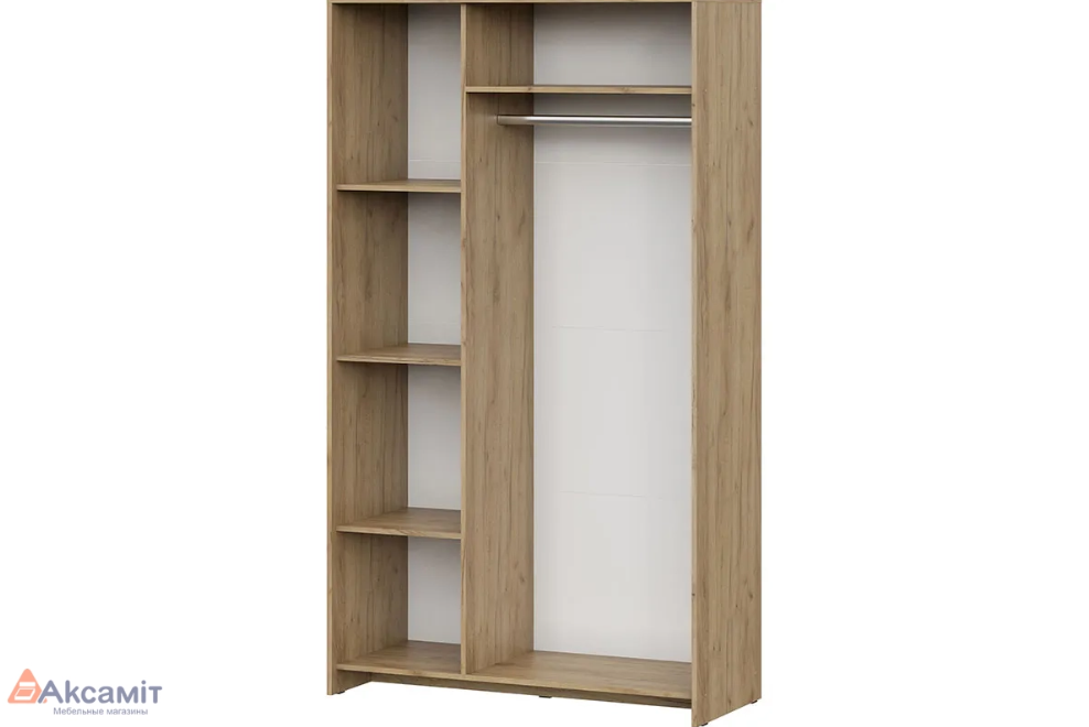В левой бельевой секции шириной 418 мм располагаются 2 съемных и 1 стационарная полки. В правой платяной секции шириной 734 мм располагаются стационарная полка вверху и металлическая штанга.