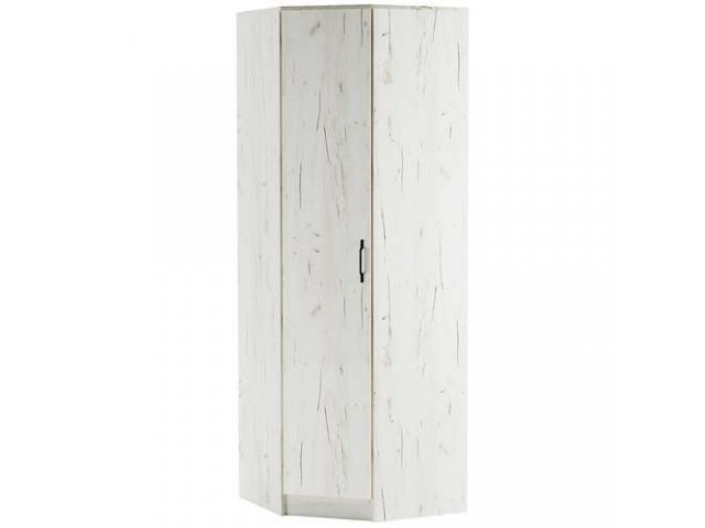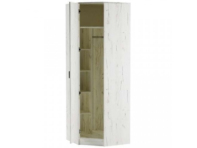 Шкаф угловой Беатрис Дуб Крафт белый - одностворчатый угловой шкаф с 4-мя полками и поперечной металлической штангой. На фасад устанавливается стильная матовая металлическая ручка черного цвета.