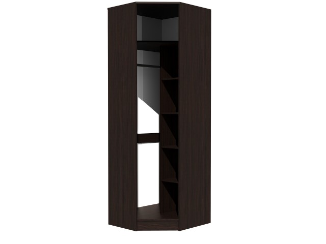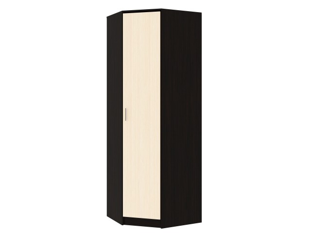 Угловой шкаф из модульной спальни «София» - стандартный угловой шкаф в контрастном двухцветном исполнении со штангой и полками для белья. Шкаф имеет цокольное основание.