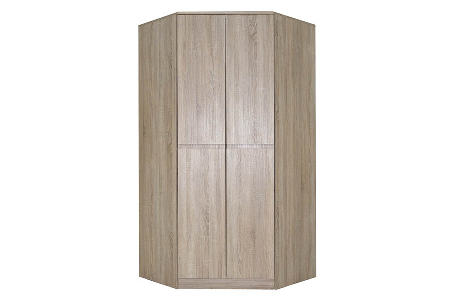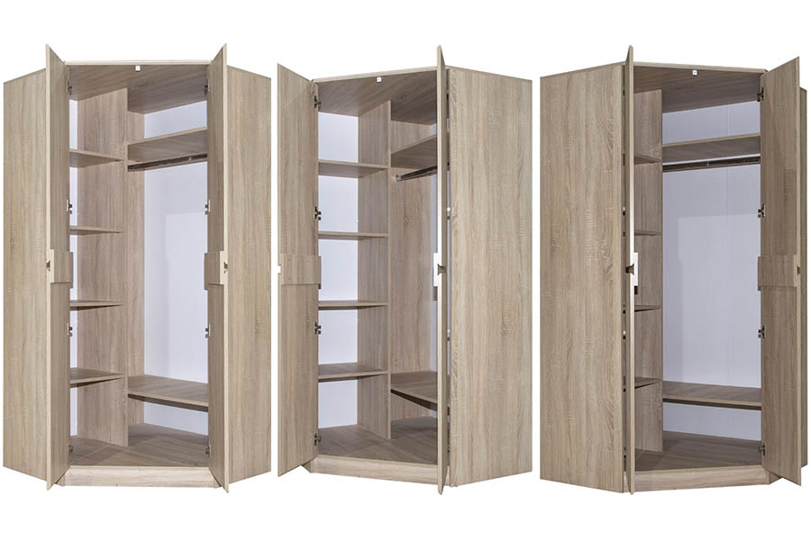 Комбинированный угловой шкаф отличается продуманной конструкцией и двумя вместительными отделениями – отсеком для одежды с горизонтальной штангой и стеллажом с полками, на которых можно разместить документы и книги. Распашные створки оснащаются удобными интегрированными ручками. Универсальная модель подходит для офиса и дома.