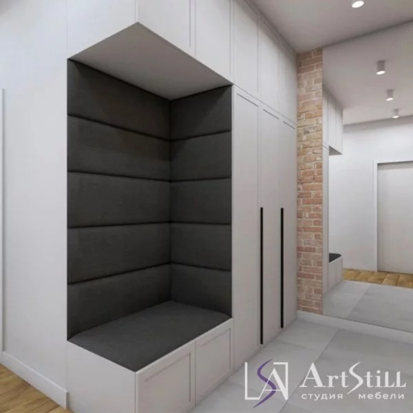 Шкаф выполнен в «Стиле неоклассика». Шкаф в прихожую переходит в вешалку, которая обшита мягкой тканью. Длинные ручки украшают простой по дизайну шкаф.