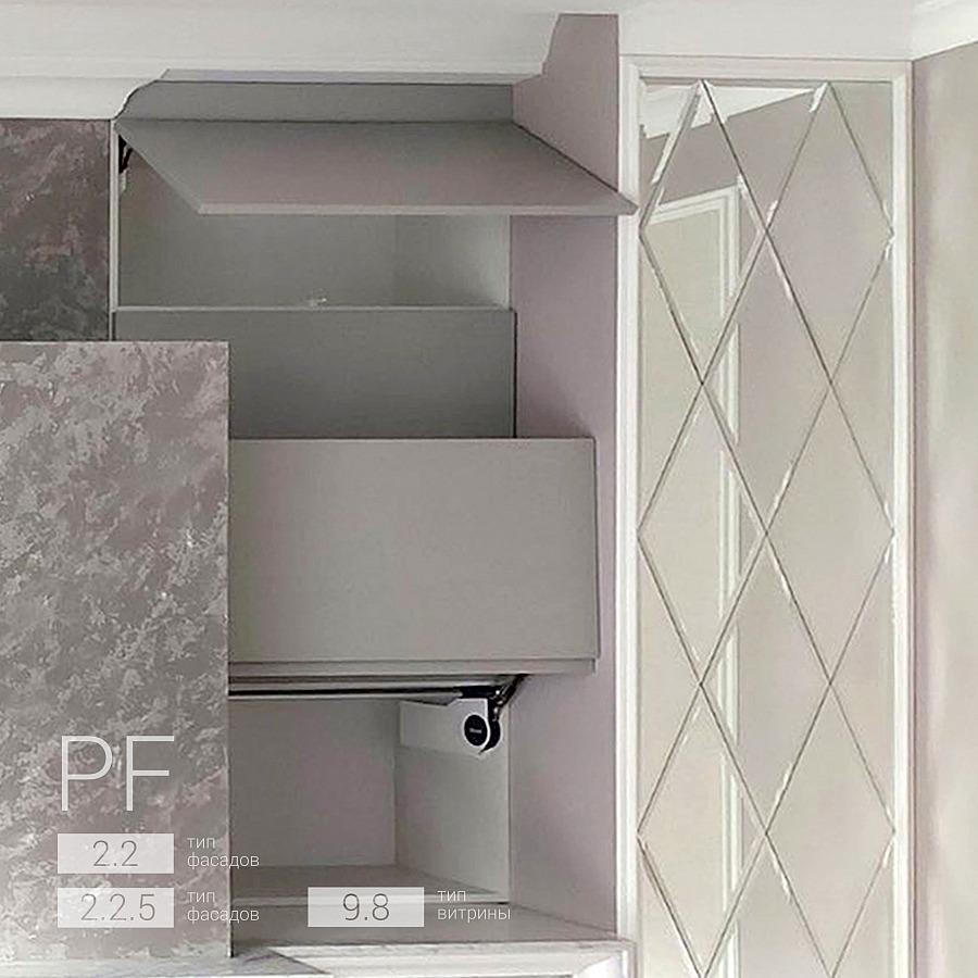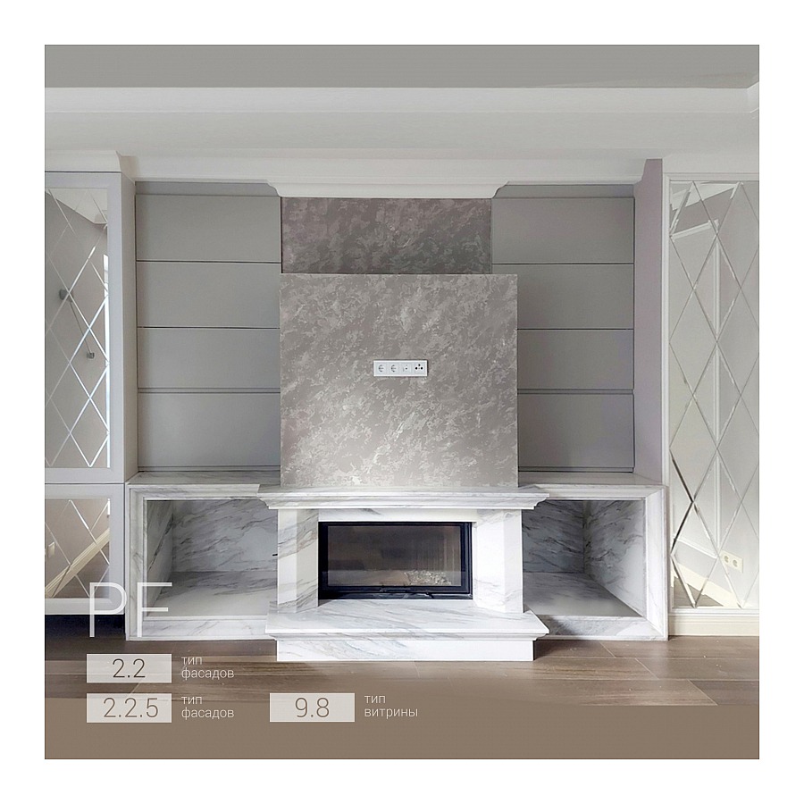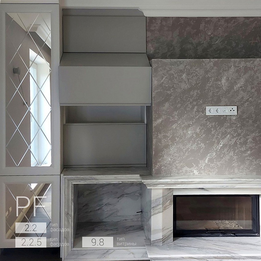 Витрина: Pan Fasad ТМна основе МДФ, тип 9.8, матовая покраска по палитре NCS N1000, вставка – осветленное зеркало с гравировкой ромбы 10 мм.
