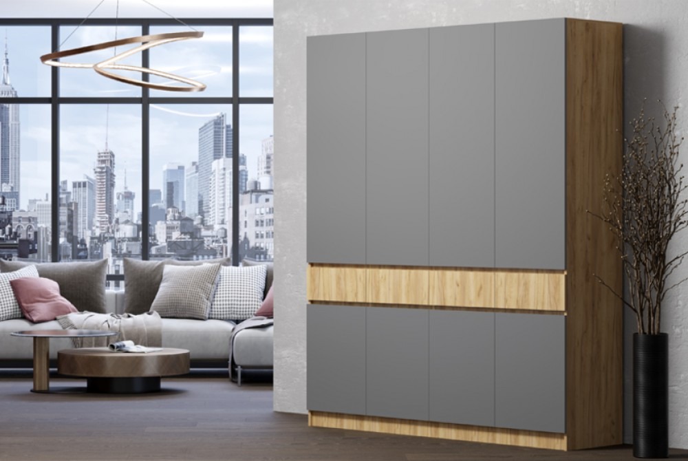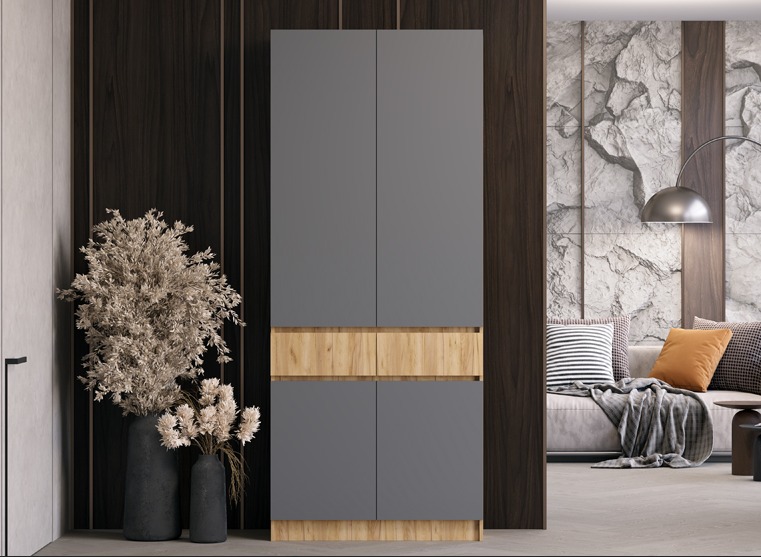 Шкаф "Артек" имеет стильный и современный внешний вид, который гармонично впишется в любой интерьер. Благодаря просторным отделениям и хорошей организации внутреннего пространства, у вас будет достаточно места для всех ваших вещей. Удобная конструкция. Без ручек. На уровне рук расположены выдвижные ящики с направляющими полного выдвижения. Выше — платяной шкаф с вешалкой. Снизу- полки.