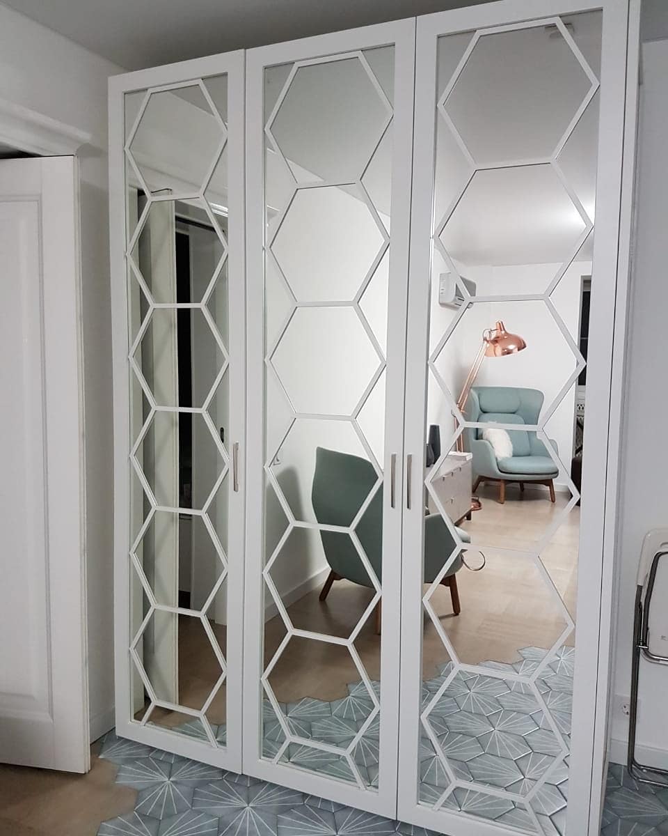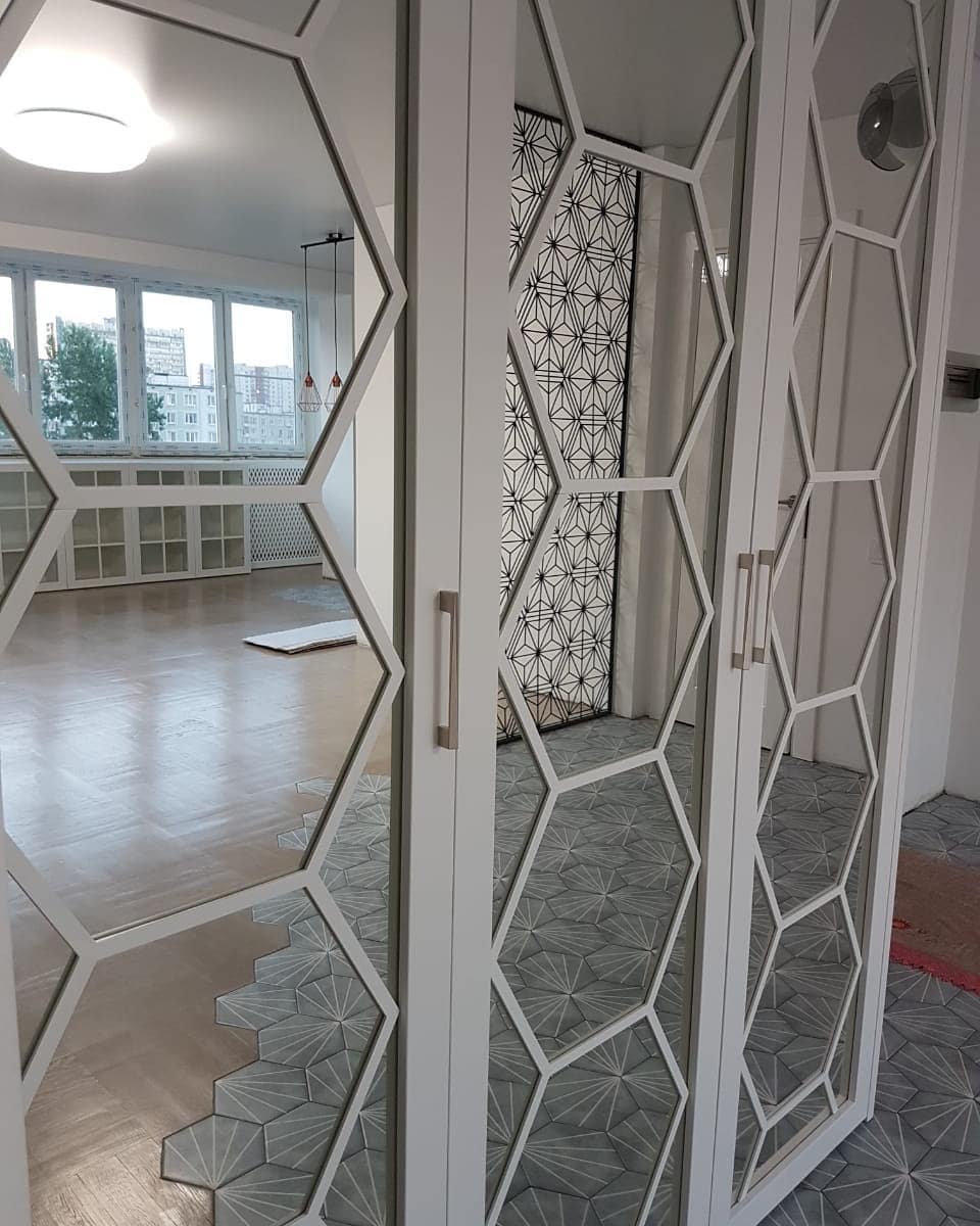 Выполнен в белом цвете. Фасады: зеркало с шестиугольниками.