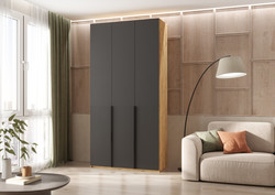 Трехдверный распашной шкаф с фасадными шухлядами.