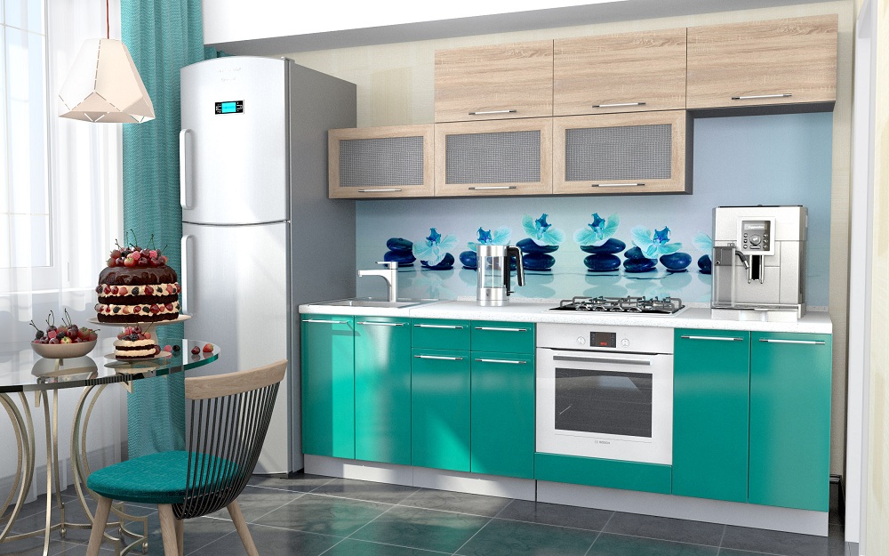 Прямая кухня в смелой сочной цветовой гамме. Три ниши верха в рамном остеклении.