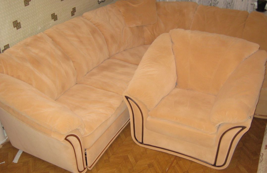 Перетяжка дивана и кресла в плюшевую обивку