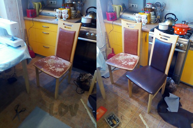 Закрепление новых слоев поролона на каркас и замена обивки сидений.