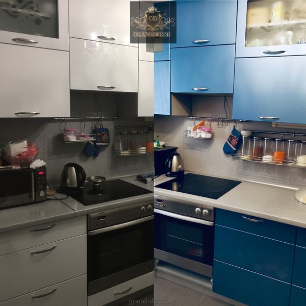 Представленные кухонные фасады были перекрашены в синий глянцевый цвет, что значительно дешевле, чем замена кухни целиком. Фасады приняли новый вид и помещение кухни заиграло новыми красками.