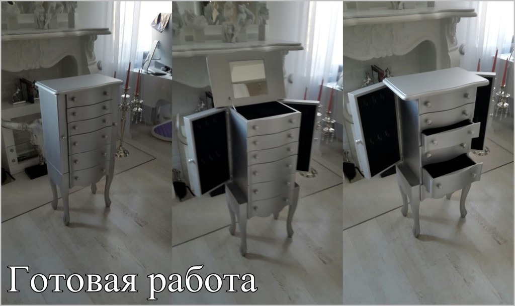 Реставрация с перекраской и патинированием (серебро), лакировка, замена фурнитуры.