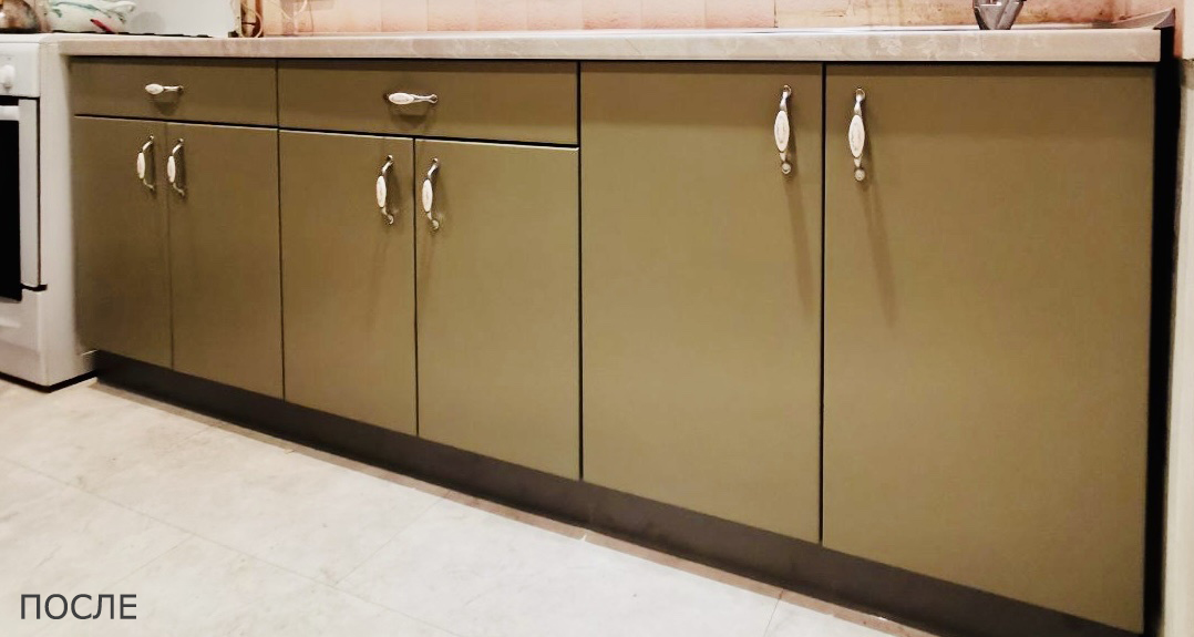 код 122589Полная реставрация кухонного гарнитура с заменой корпуса и покраской.