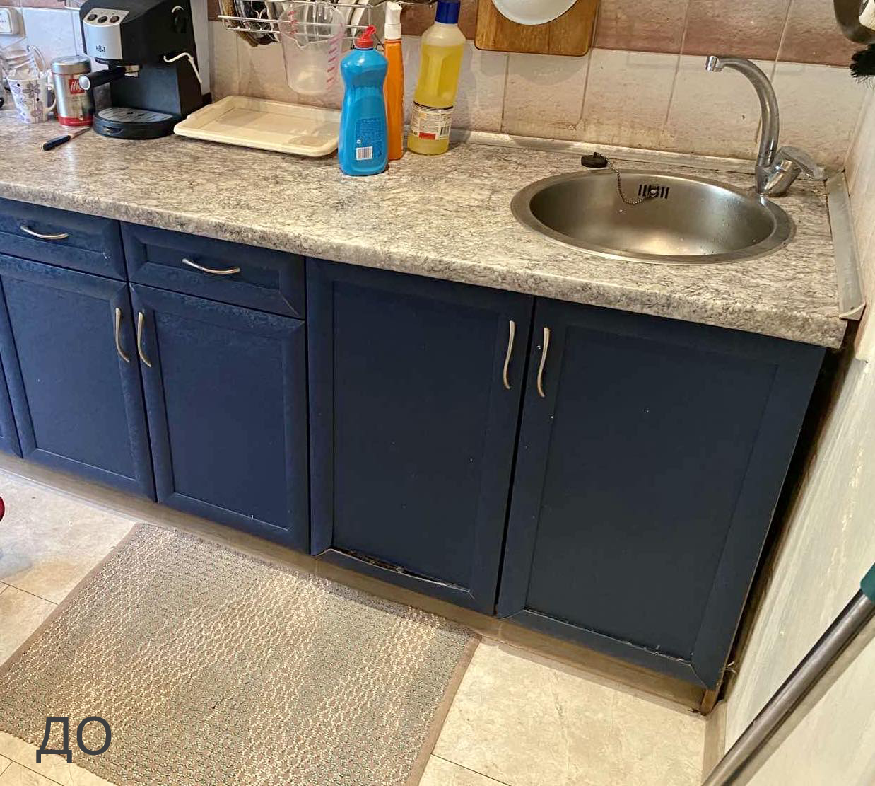 Для полной реставрации кухни была произведена замена старого корпуса гарнитура на новый, изготовлены новые фасады из МДФ с матовым гладким покрытием в цвете темной охры, а также произведена замена столешницы.