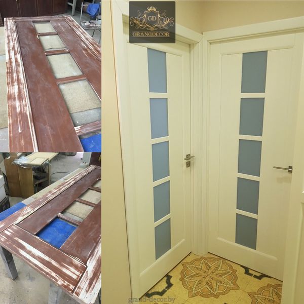 Старая и непригодная для использования дверь была восстановлена до неузнаваемости. Опытными специалистами были выполнены работы по покраске двери в белый матовый цвет, стеклянные вставки и петли заменены на новые. Установлена удобная хромированная ручка.