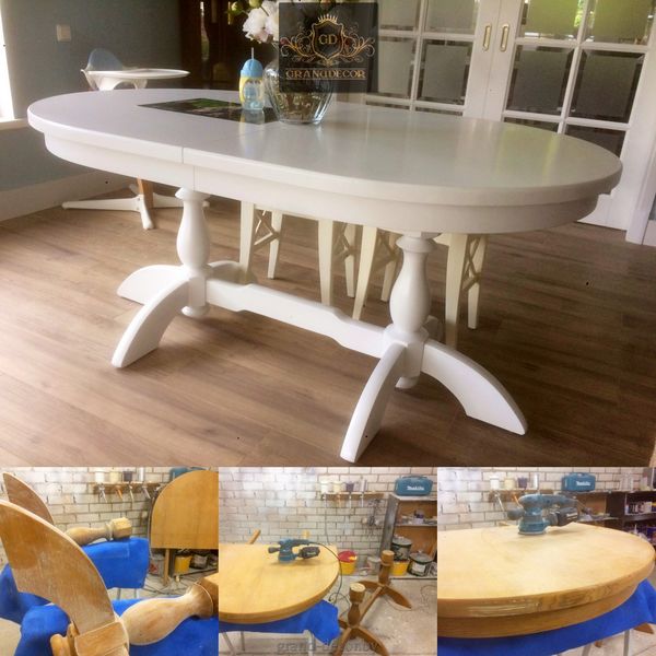 Большой семейный стол за долгие годы пользования потерял свой презентабельный вид, а деревянный каркас стал шатким и неустойчивым. Для сохранения такого предмета мебели понадобятся услуги опытных специалистов. Наши мастера выполнили полное восстановления стола, столешница тщательно отшлифована, устранены все трещины и потертости. Стол был окрашен в белый цвет и покрыт экологически безопасными лаками. Конструкция стала крепкой и устойчивой.