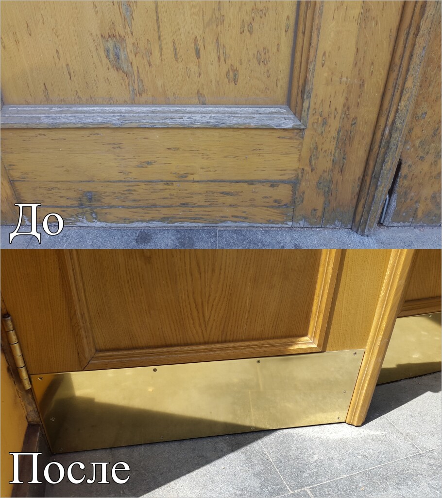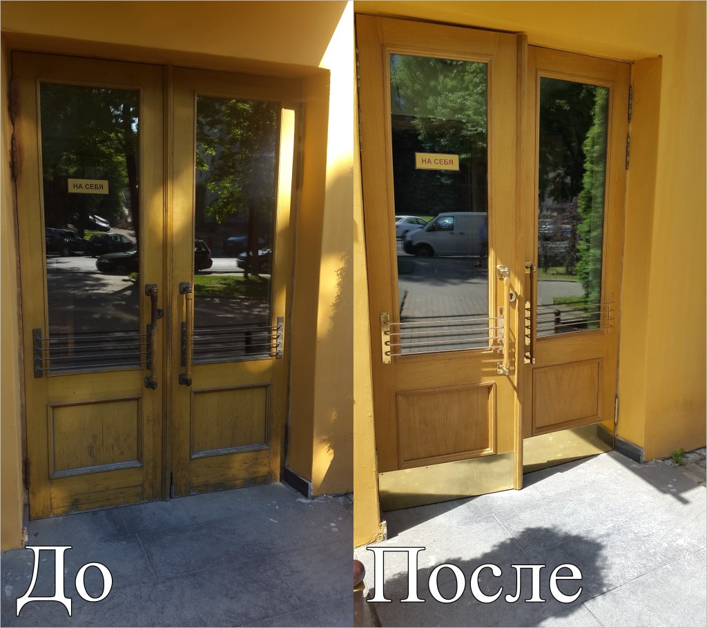Реставрация дверного полотна (перешпонирование), с перетонировкой в тот же цвет, покрытие уличным лаком повышенным к атмосферным воздействиям, изготовления новой деревянной ручки, изготовления декоративных копий штапиков держащих филенку и стекло, изготовления и установка противоударной металлической накладки. Очистка, полировка фурнитуры дверного блока. Демонтаж/монтаж только дверного полотна.