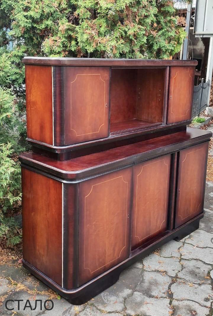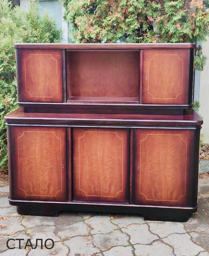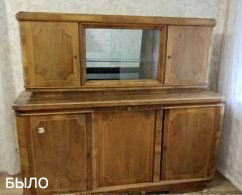 Полное обновление старого кухонного буфета, изготовленного из массива дерева. В процессе реставрации были устранены дефекты, приобретенные мебелью за срок эксплуатации, изменен цвет фасадов, проведена тонировка и восстановление лакового покрытия.