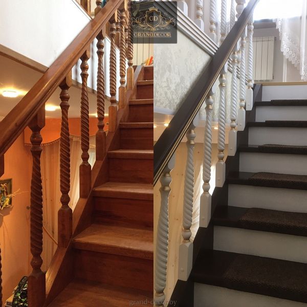 В процессе реставрации лестницы ступени и перила были тщательно отшлифованы, окрашены краской и покрыты несколькими слоями защитного лака. Комбинированные цвета гармонируют друг с другом. Расшатанная и скрипучая конструкция стала ровной, без вмятин и скрипа.