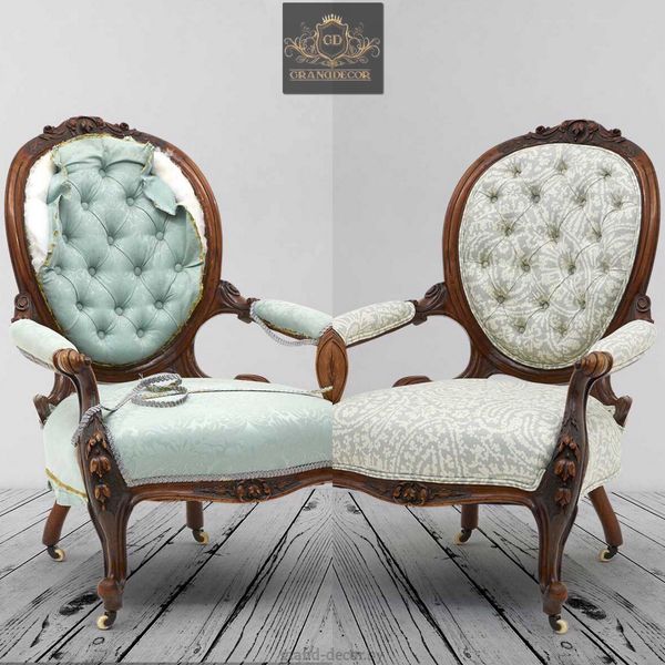 Реставрация старинных кресел и мебели может достигаться различными методами. На представленном экземпляре была заменена обивка на новую с каретной стяжкой, устранены все дефекты и потертости. Каркас кресла стал устойчивым и надежным.