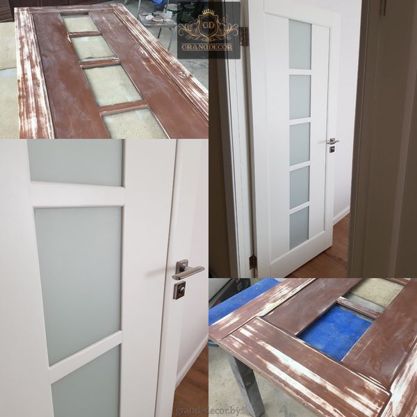 Старая и непригодная для использования дверь была восстановлена до неузнаваемости. Опытными специалистами были выполнены работы по покраске двери в белый матовый цвет, стеклянные вставки и петли заменены на новые. Установлена удобная хромированная ручка.