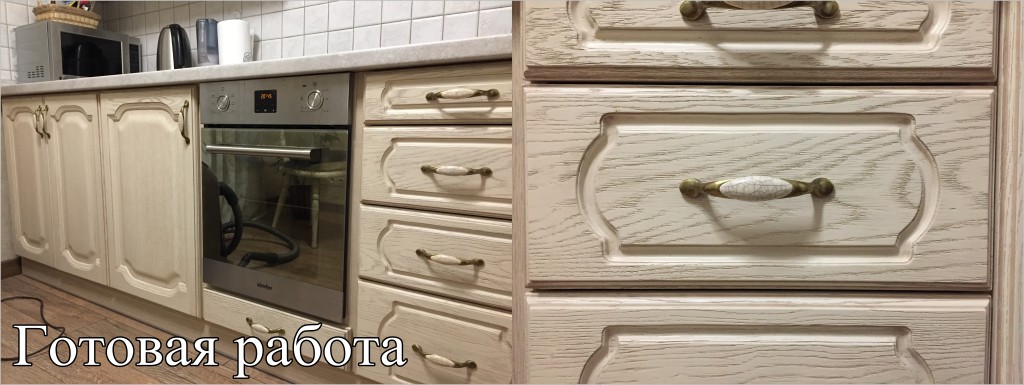 Замена кухонных фасадов с покраской и заменой цвета, изготовление недостающих элементов,