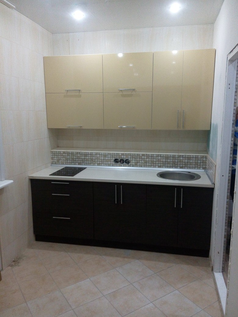 Мастером собрана прямая кухня с двухцветным фасадом.