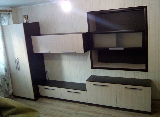 код 86510Собран каркас под венге и фасад под беленое дерево. Застекленный модуль встроен в нишу в стене.