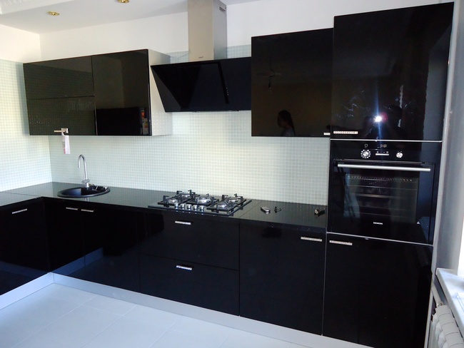 Установлена угловая кухня с черным глянцевым фасадом.