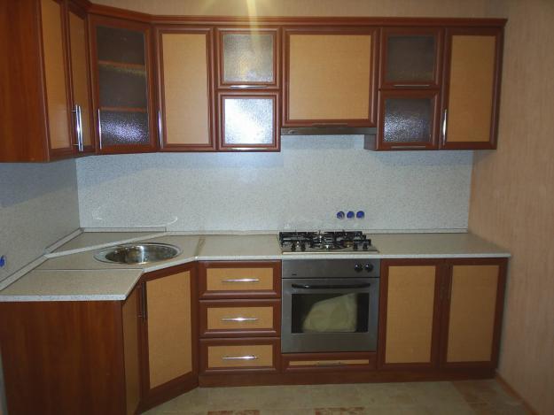 код 86496Кухня смонтирована с диагональным углом и остеклением.