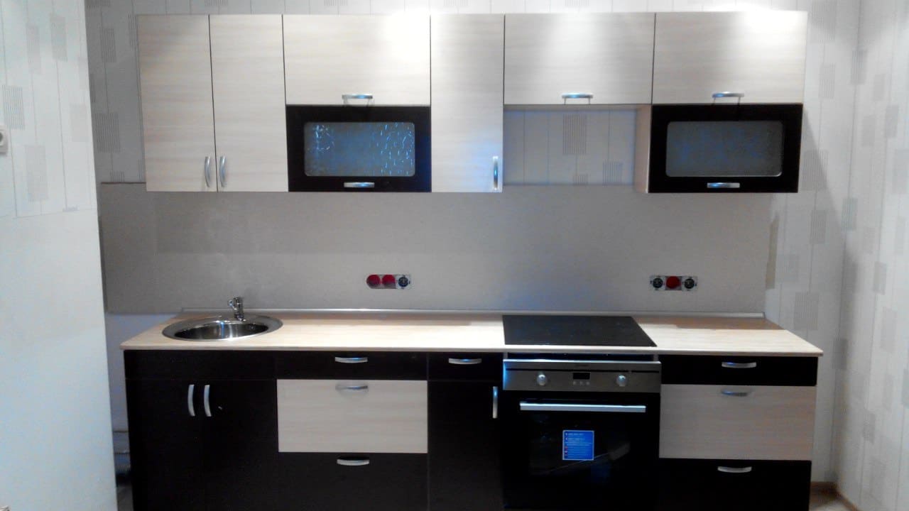 Произведена сборка двухцветного, линейного кухонного гарнитура.