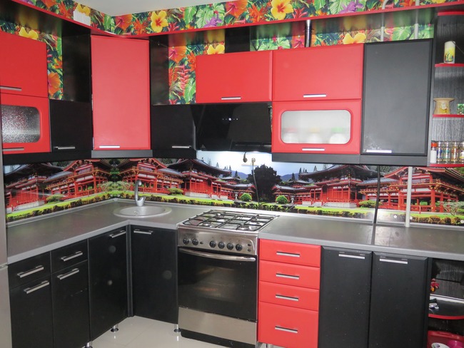 Сборка двухцветного кухонного гарнитура с серой столешницей и множеством навесных полок.
