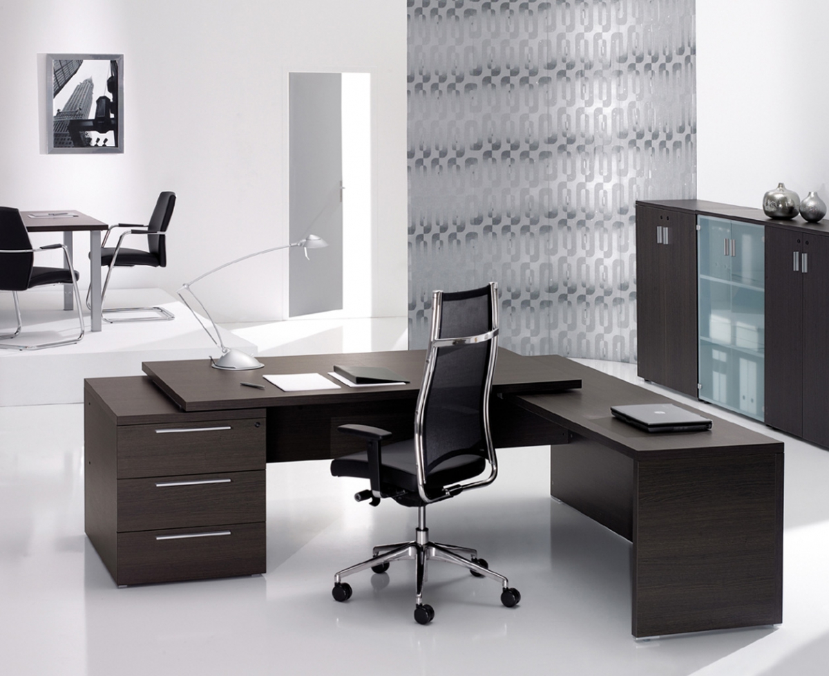 Собран стильный кухонный гарнитур из распила ДСП светлого цвета с чёрной столешницей.