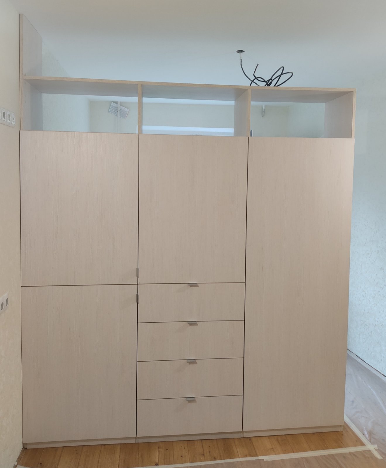 Собран комод в цвете венге с белыми крышками выдвижных ящиков.