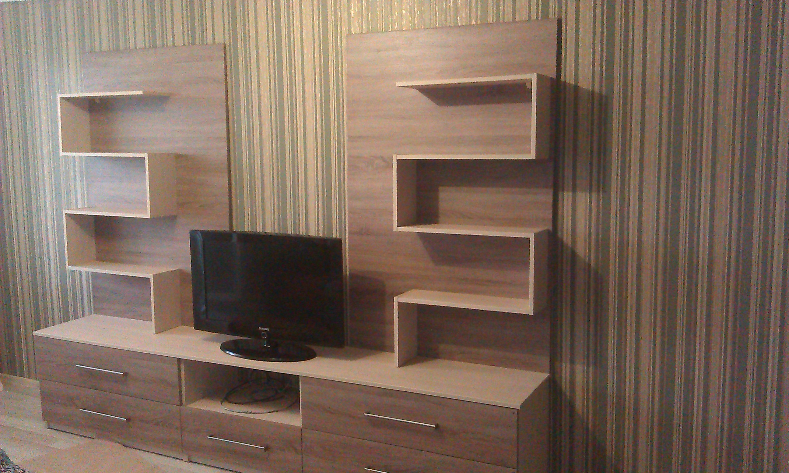 Собрана арочная симметричная стенка в расцветке венге и под светлое дерево.