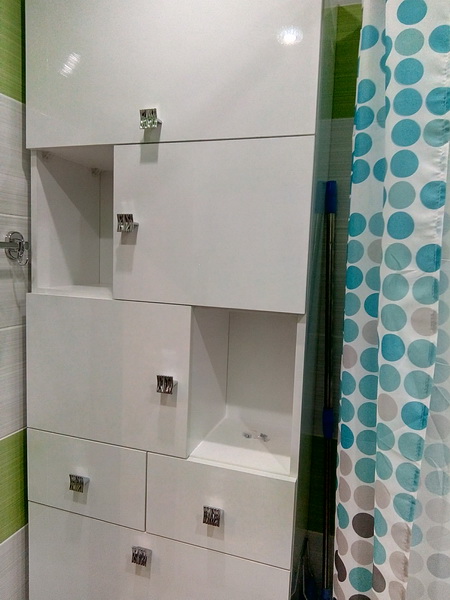 Стена состоит из одних дверок, они выполнены без ручек, открываются от нажатия tip-on.