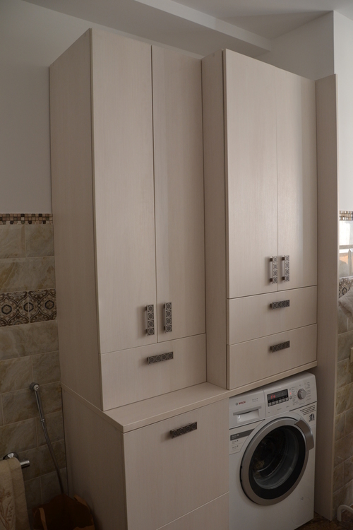 Глянцевые фасады, удобная фурнитура, ниша для бытовой техники.