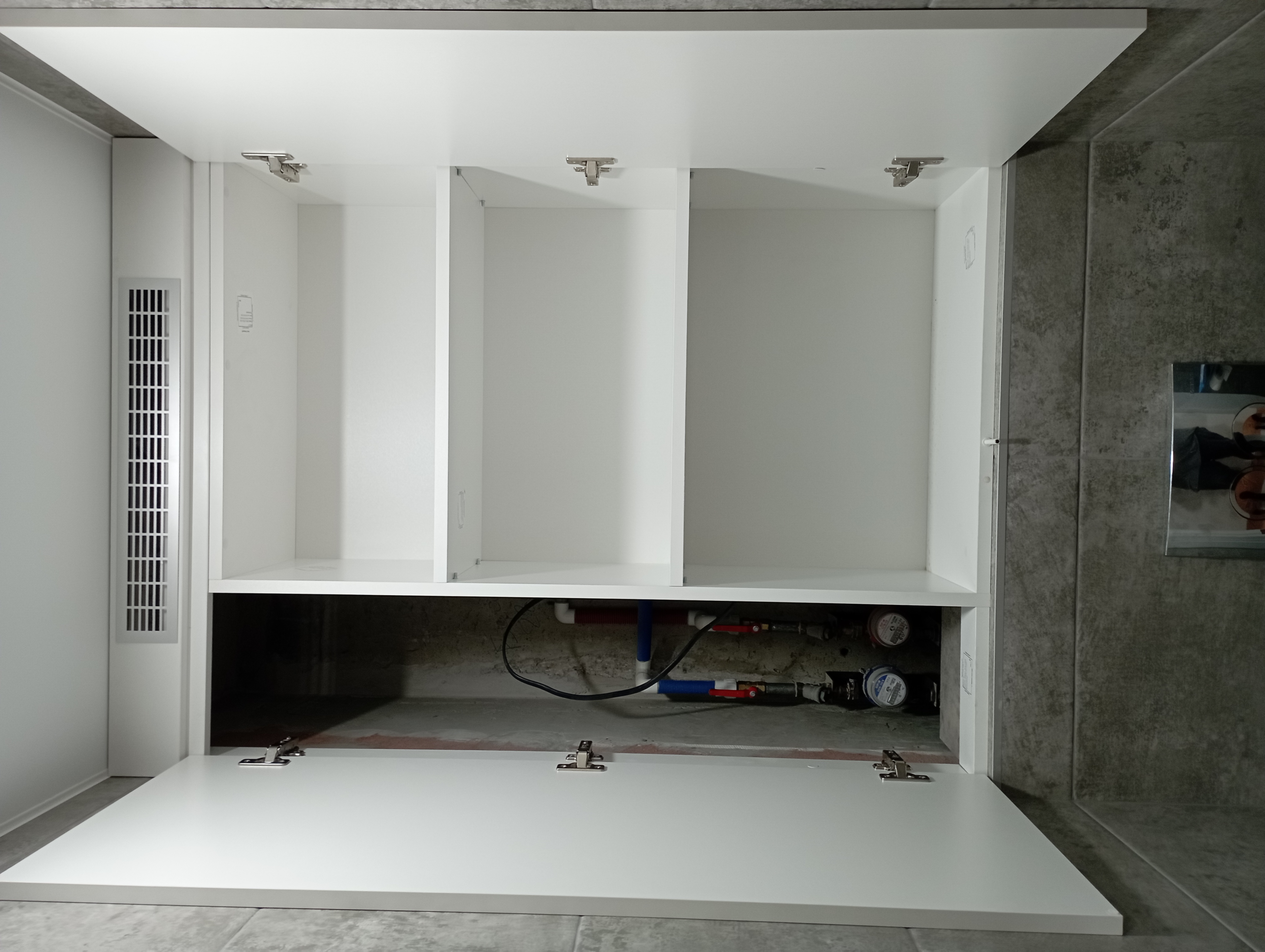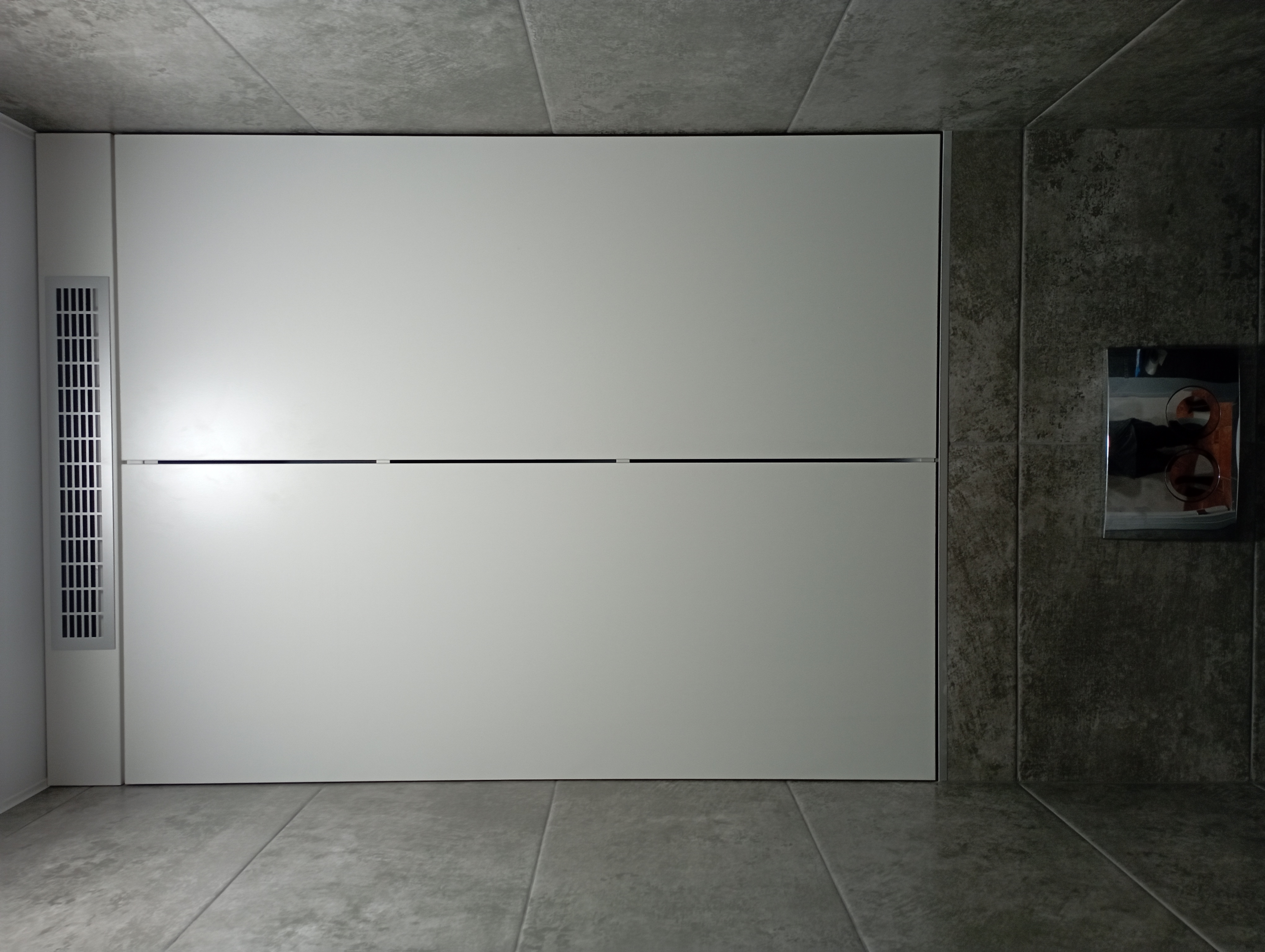Стена состоит из одних дверок, они выполнены без ручек, открываются от нажатия tip-on.