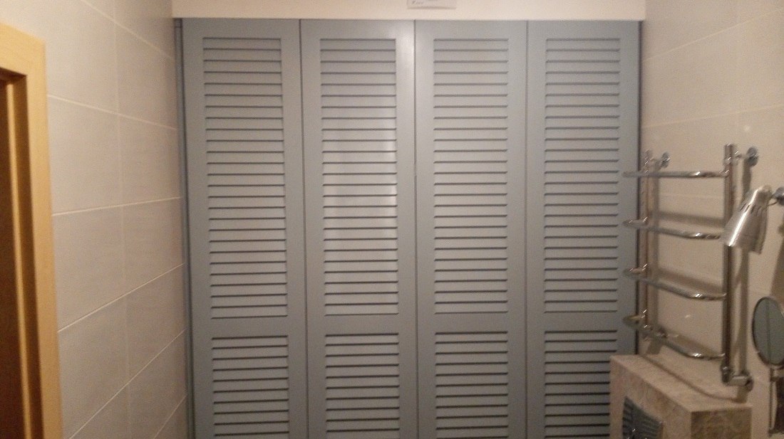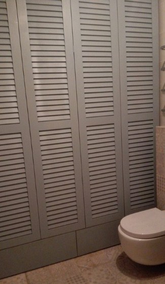 Встроенный в нишу ванной шкаф нейтральной серой расцветки в четыре створки с фасадом жалюзи. Выполнен из массива дерева и легко вентиллируется, не накапливая влагу.