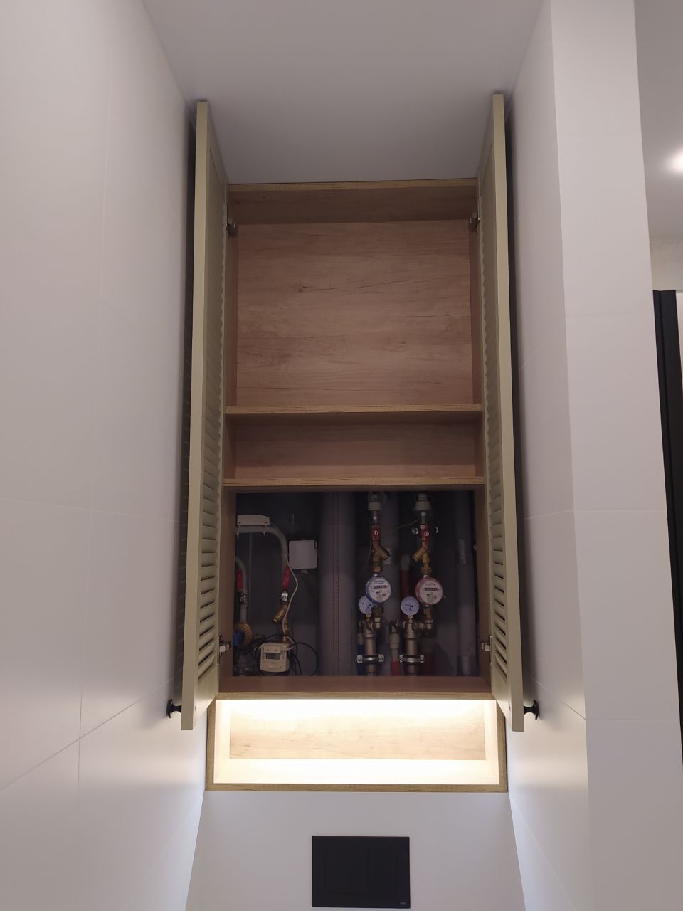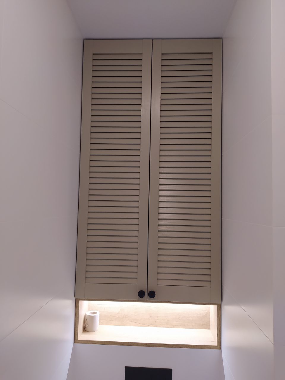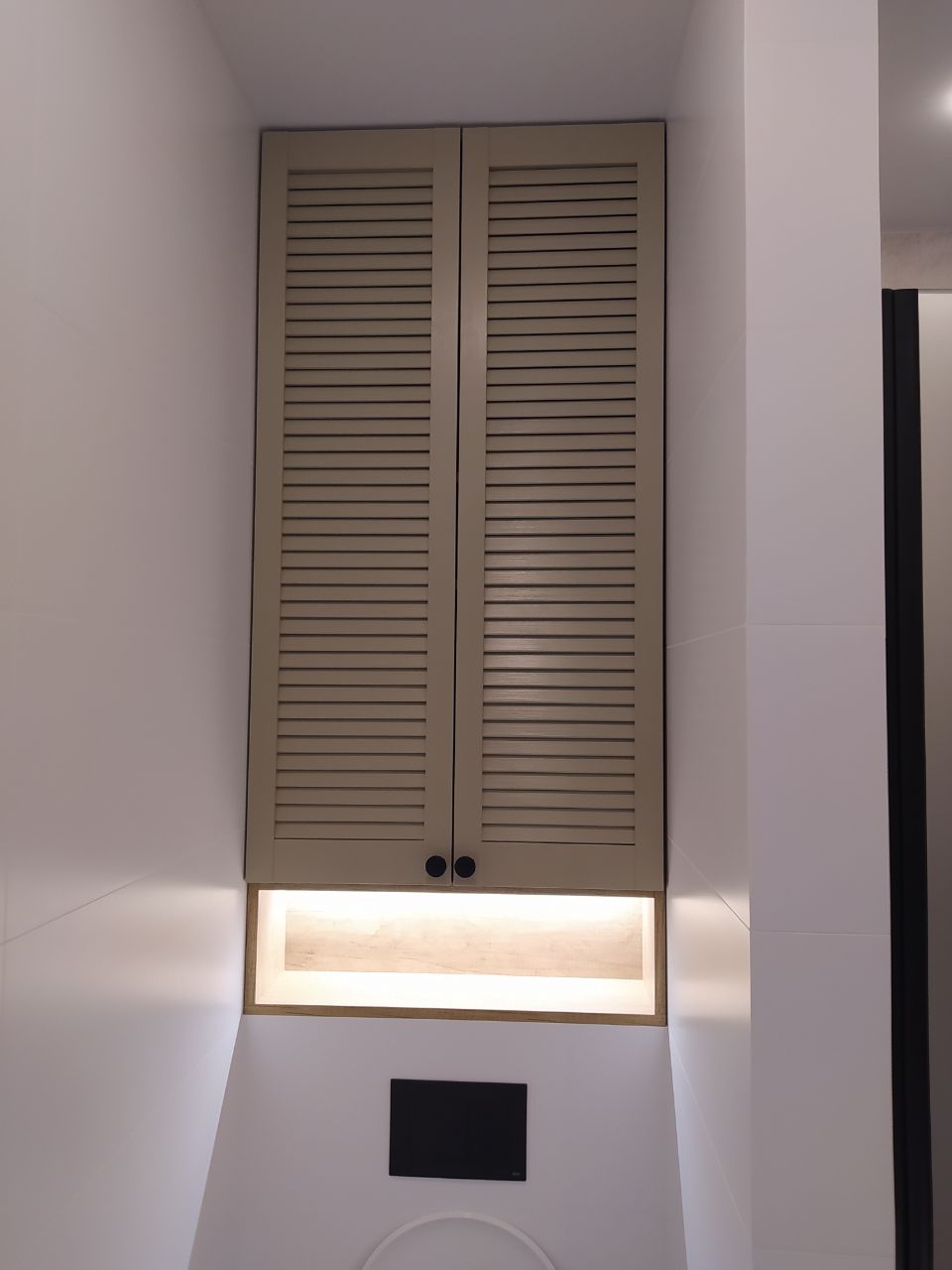 Красивый оливковый цвет, возможность проветривать помещение, не сбитый дизайн! – это все жалюзийные двери. Они закрывают не только коммуникацию, но и очень удобный шкаф.
