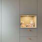Распашные дверцы, ниша с подсветкой, выдвижные ящики.