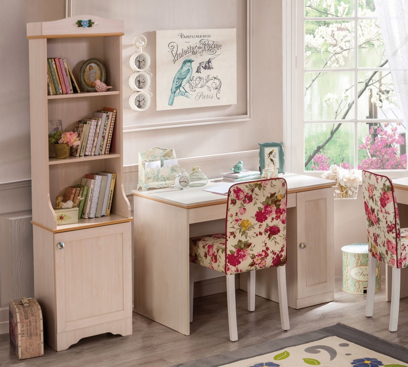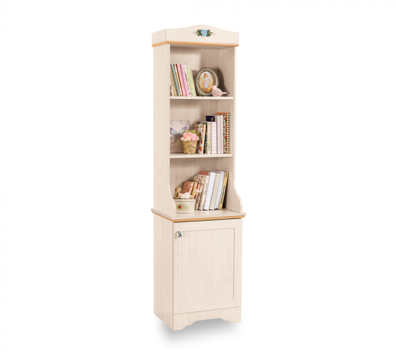 Комбинированная расцветка. Множество открытых полок и выдвижных ящиков.