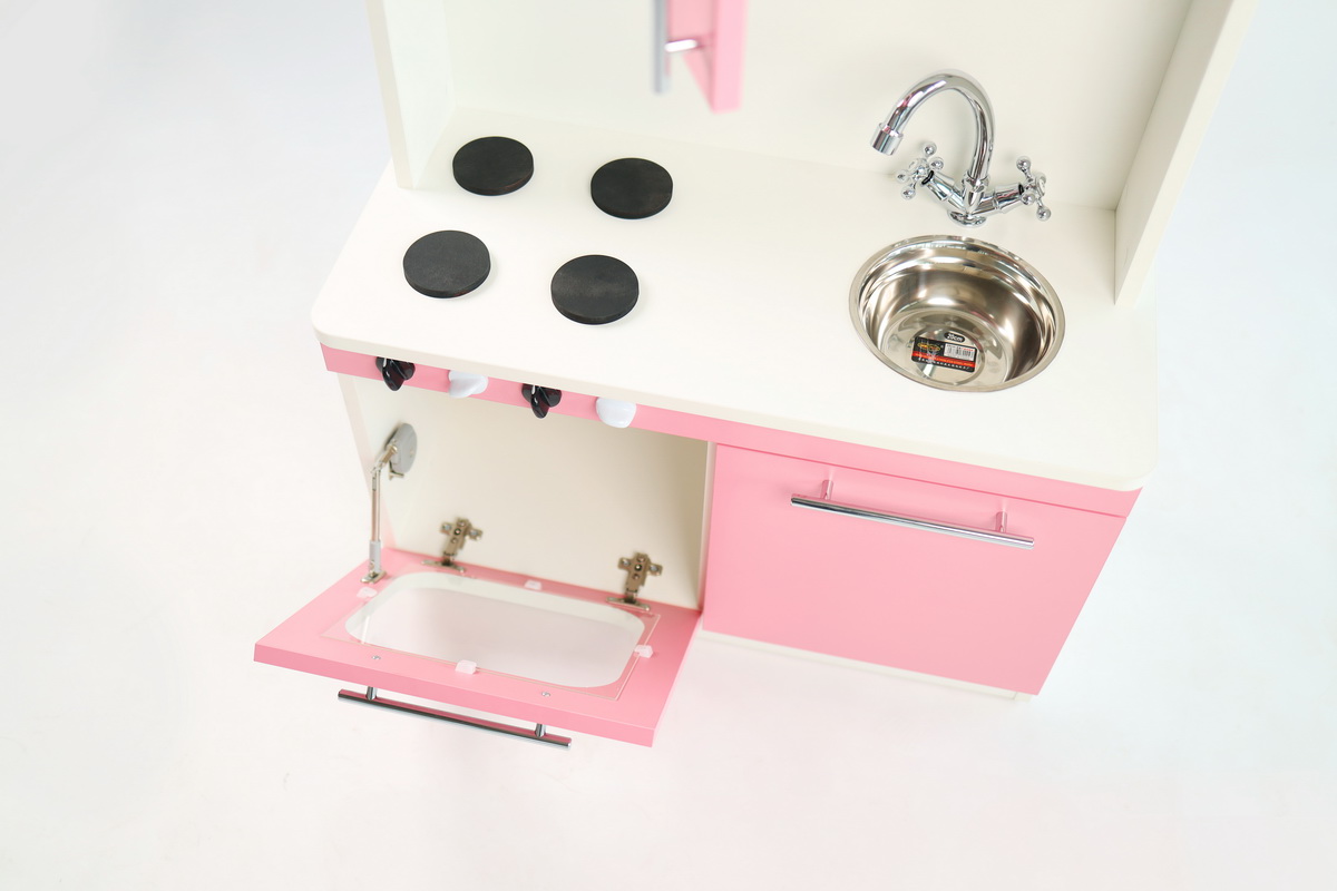 Игровая мебель подходящего для малышки размера полностью повторяет привычный кухонный антураж: выдвигающиеся шкафчики, открывающиеся дверцы, подвесные держатели для посуды, холодильник, плита, духовка и даже раковина. Некоторые модели содержат также стиральную машину или барную стойку. Проработанная детальность увлекает ребёнка на долгое время и позволяет детской фантазии каждый раз придумывать новые варианты игры.