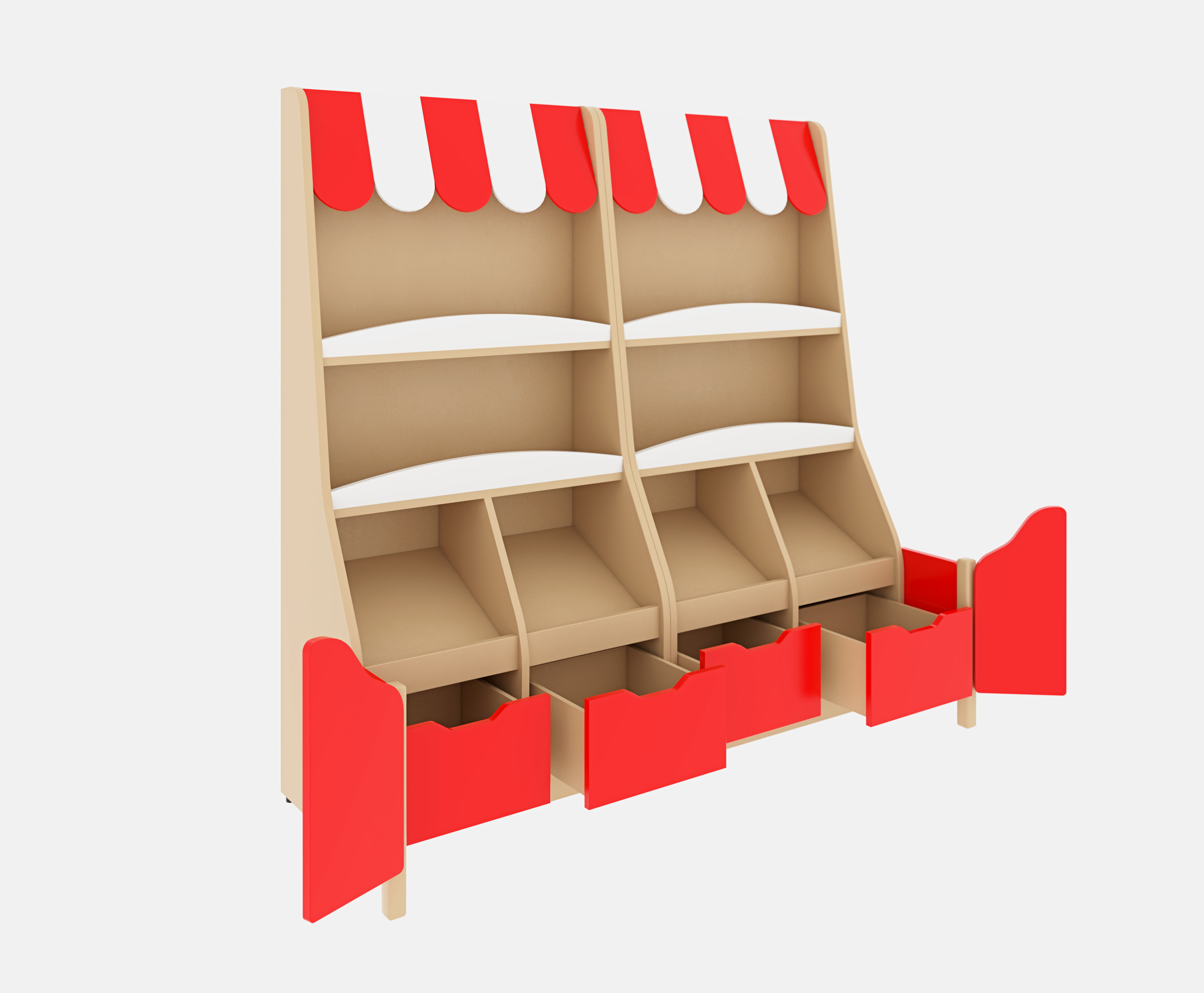 Как и в настоящем магазине, наш набор детской игровой мебели обладает многочисленными витринами, стеллажами и полочками, на которых дети могут расставить все свои многочисленные игрушки. А для тех вещей, что всё же не поместились, или ждут своей очереди для будущей «продажи», предусмотрены шкафчики с закрывающимися дверцами. В них дети могут спрятать товары, зарезервированные для будущих покупателей или сообразить своеобразное хранилище.