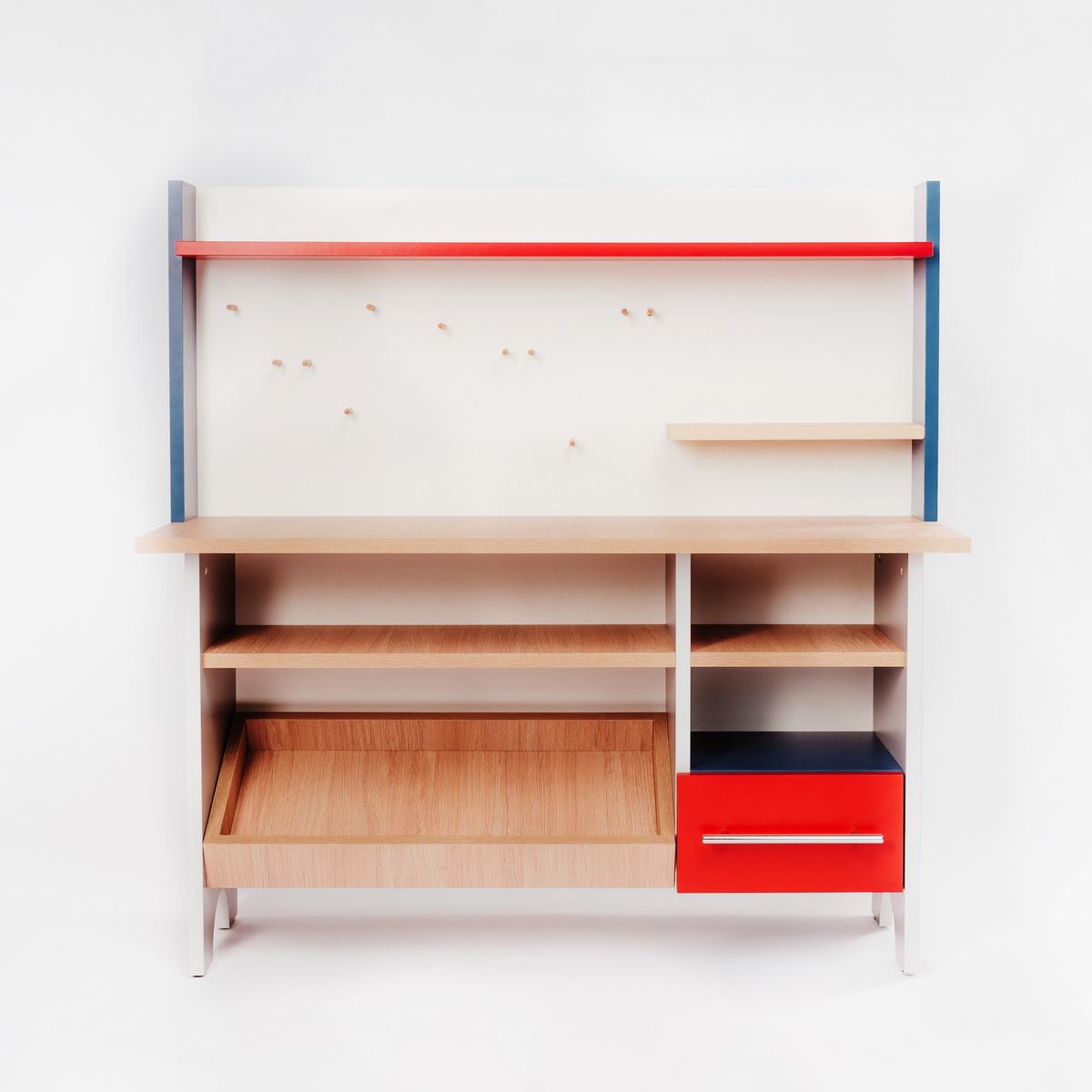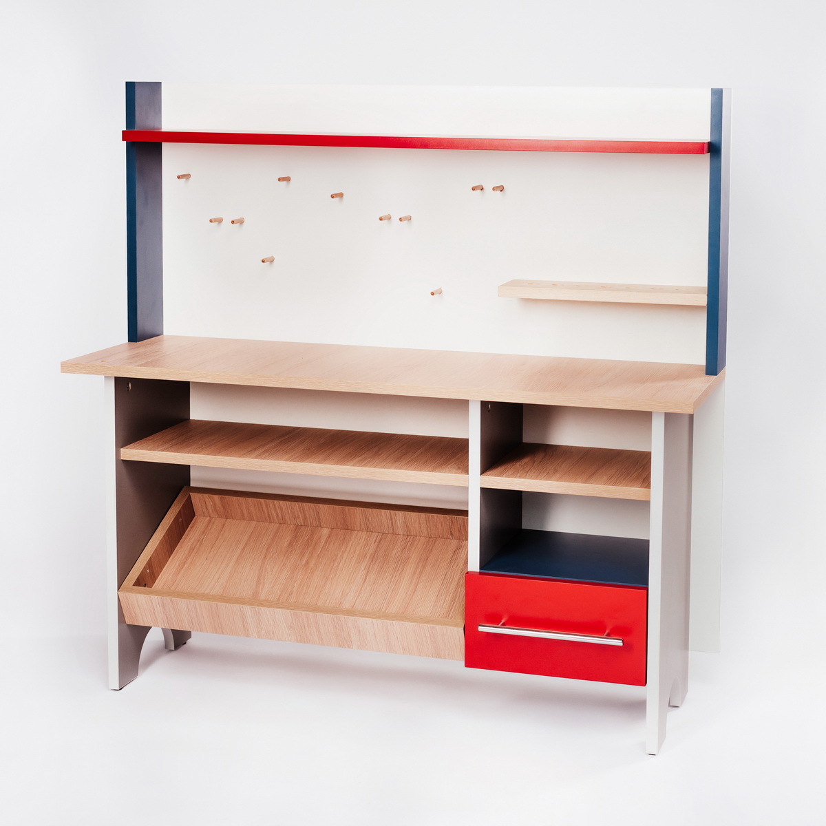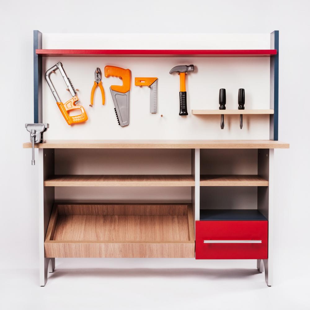 Широкая рабочая поверхность, полочки и стеллажи для хранения отремонтированных и ещё ждущих починки вещей, и целый набор пластмассовых инструментов для любых творческих замыслов создают ребёнку уникальное рабочее пространство для изучения, развития и творчества.