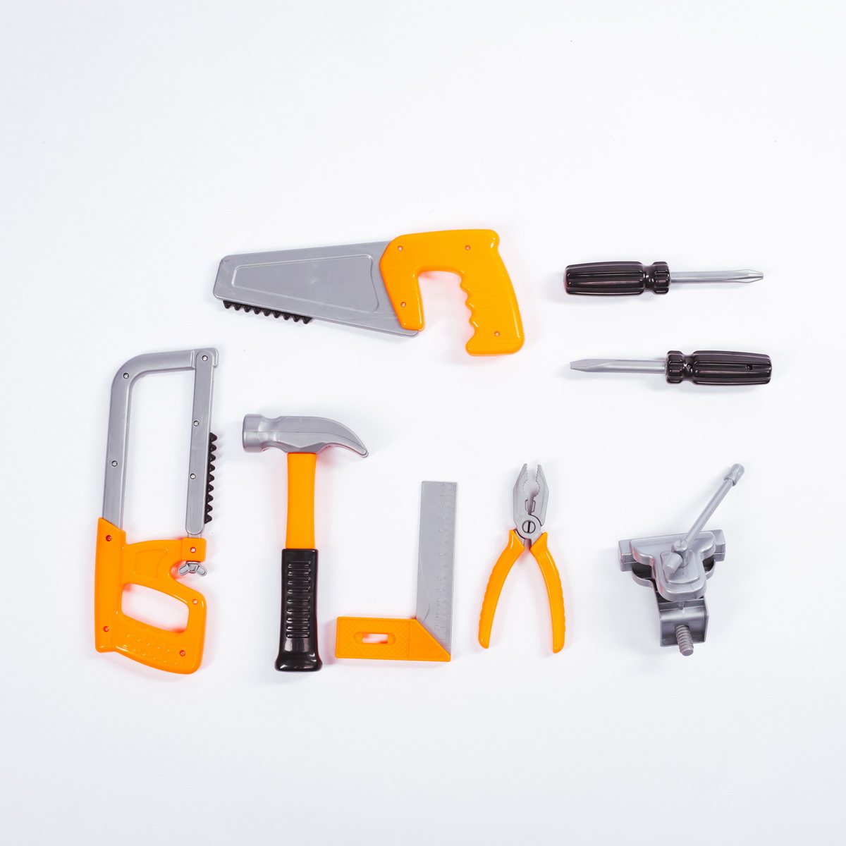 В набор входит набор инструментов маленького мастера, чтобы малыш мог часами собирать, чинить и разбирать строительный конструктор, а так же учиться школе ремонта вместе с папой или воспитателем в детском саду: молоточки, отвёртки, пила, плоскогубцы, винтики и шпунтики.