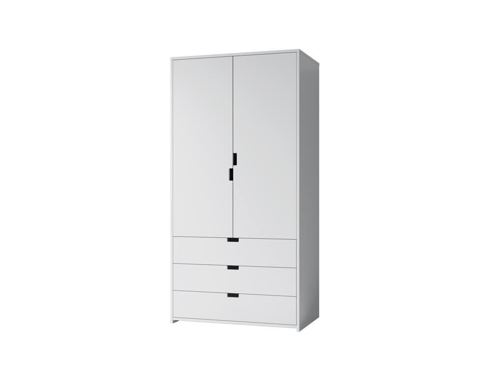 Шкаф оснащен полками, отсеком со штангой для плечиков и выдвижными ящиками.