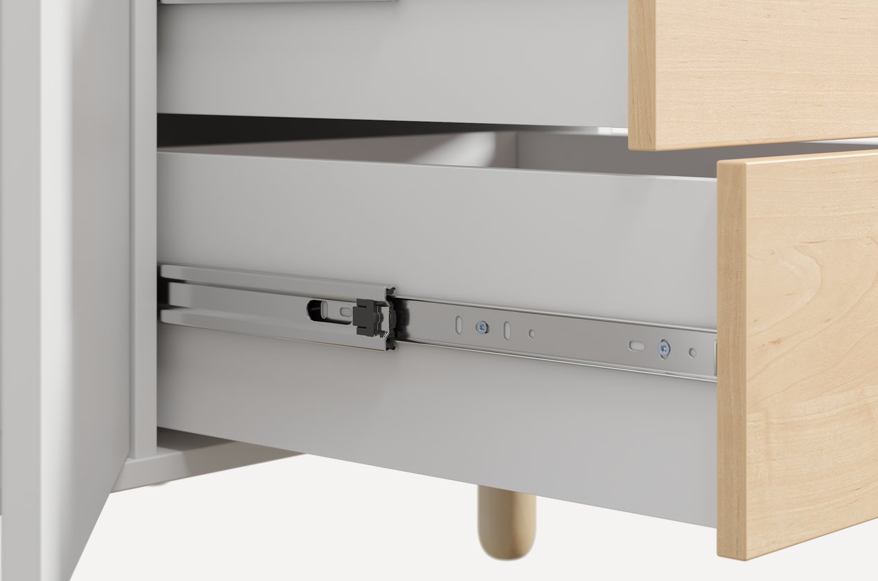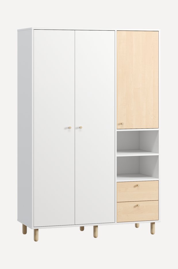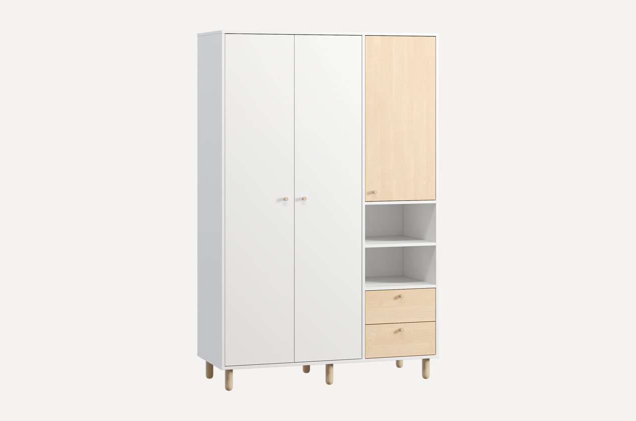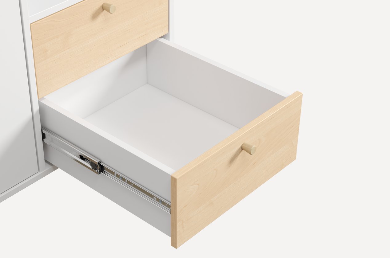 Комбинированная расцветка. Множество открытых полок и выдвижных ящиков.