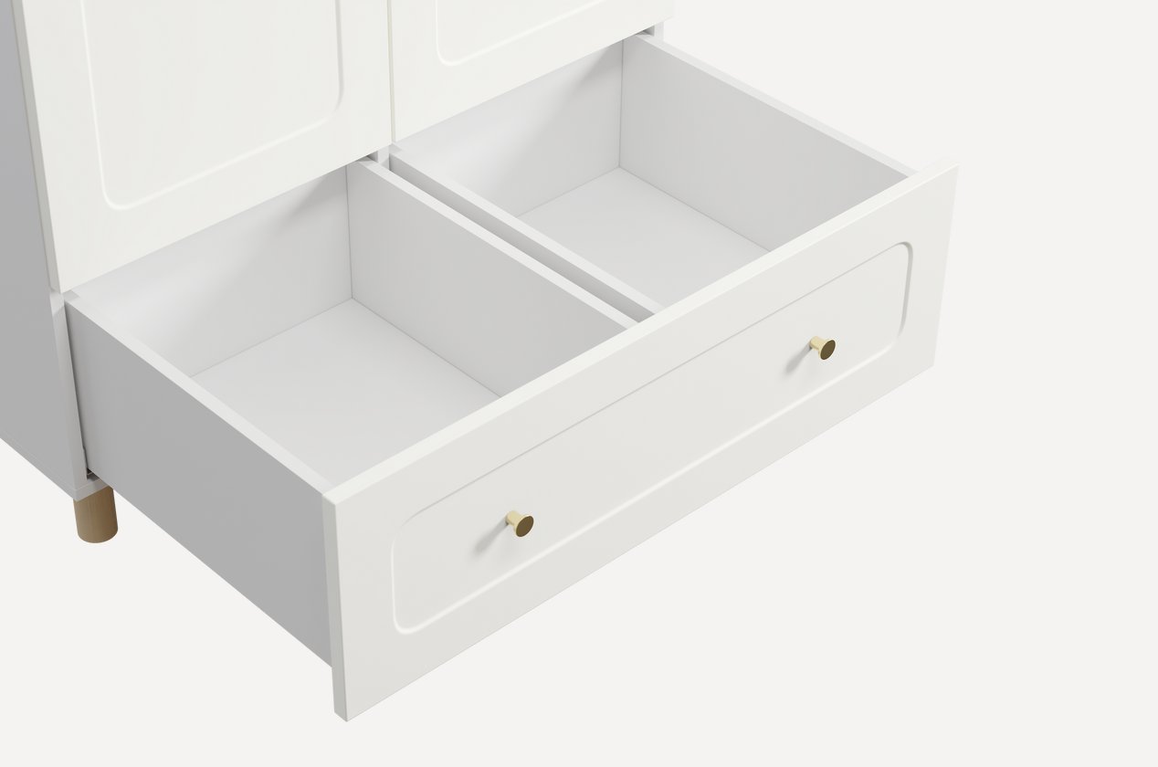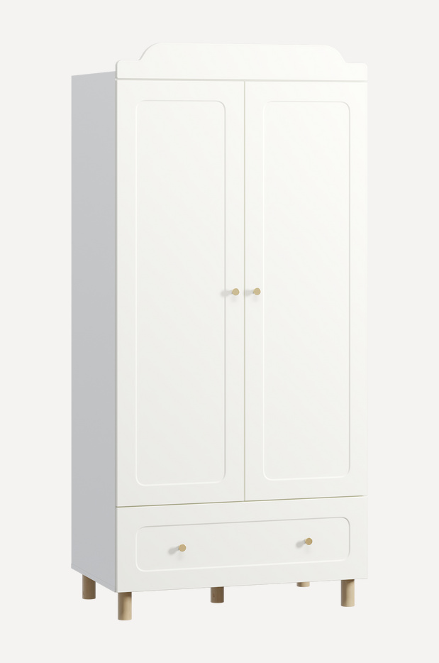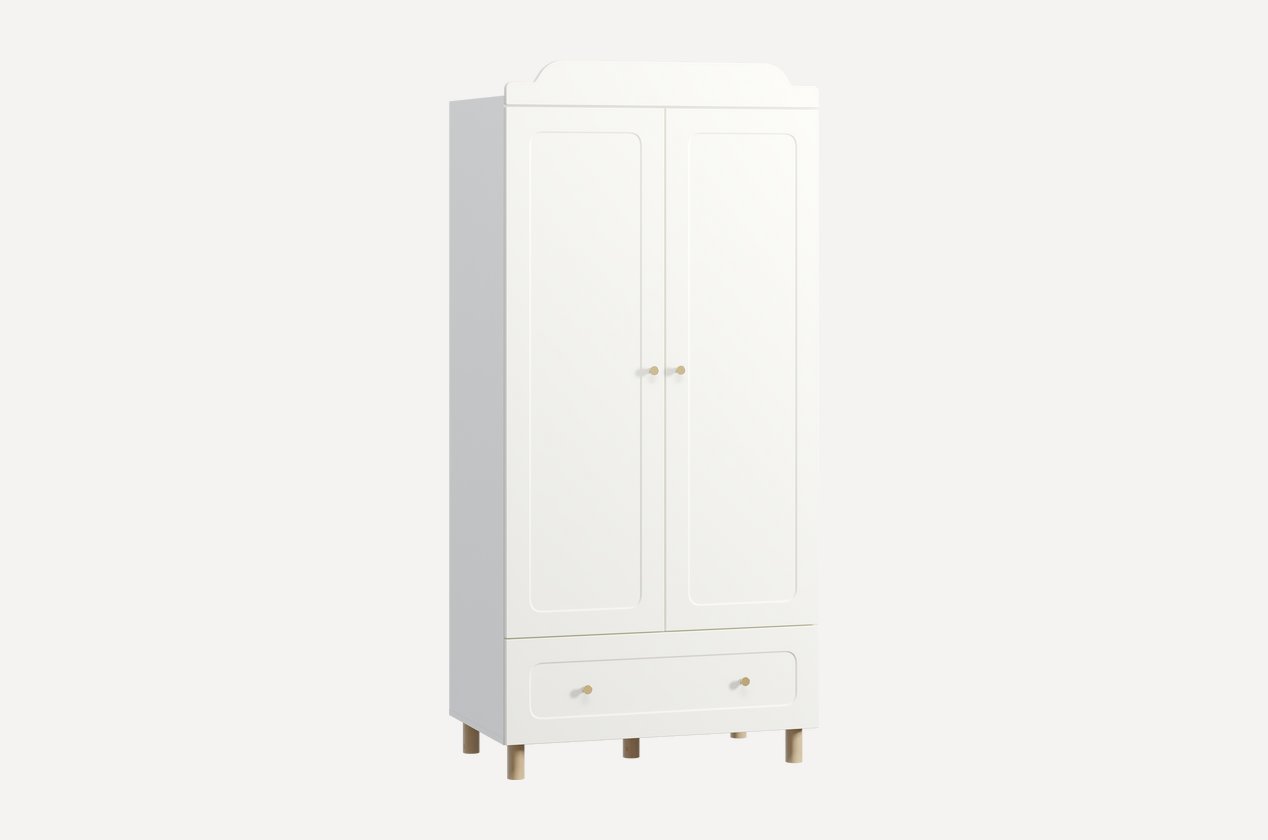 Шкаф оснащён выдвижным ящиком, который удобно использовать для хранения игрушек, белья или мелочей. Надежные опоры из сращенного массива дерева обеспечивают устойчивость и долговечность конструкции. Внутреннее пространство продумано до мелочей: 4 вместительные полки и 2 штанги позволяют удобно разместить одежду как на вешалках, так и в сложенном виде.