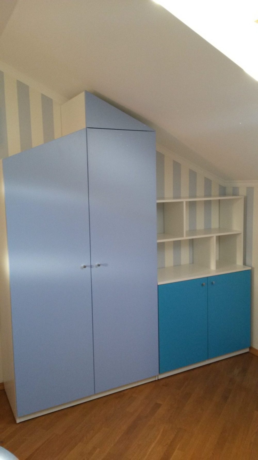 Представленный шкаф изготовлен специально для размещения под мансардным потолком. Скошенная конструкция помещения удачно обыграна в дизайне предмета мебели. Модель исполнена в приятных синих оттенках.